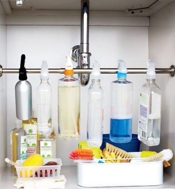 Μπορείτε να βάλετε κουρτινόξυλα κάτω από το νιπτήρα ή το ντουλάπι της κουζίνας και να βάλετε εκεί όλα τα καθαριστικά σας οργανωμένα.