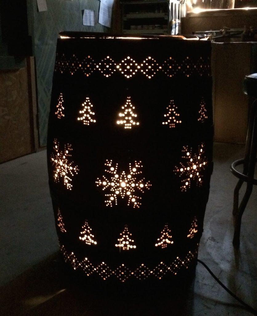 Χρησιμοποιώντας ένα στένσιλ και ένα τρυπάνι, η Wilkerson ήταν σε θέση να μετατρέψει ένα παλιό βαρέλι ουίσκι σε μια υπέροχη κατασκευή για τη μαμά της. Αφού χρησιμοποίησε το τρυπάνι για να δημιουργήσει τρύπες, τοποθέτησε φώτα μέσα του δημιουργώντας ένα υπέροχο διακοσμητικό για τις διακοπές.