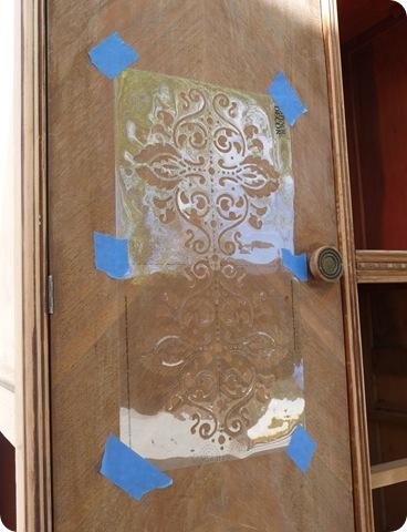 Κολλήστε το στένσιλ με χαρτοταινία στην πόρτα και με ένα σπατουλάκι εφαρμόστε την πάστα διαμόρφωσης πάνω στο στένσιλ.