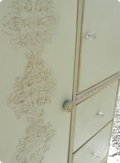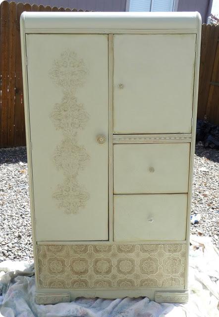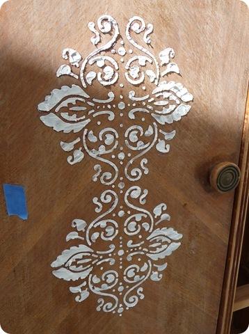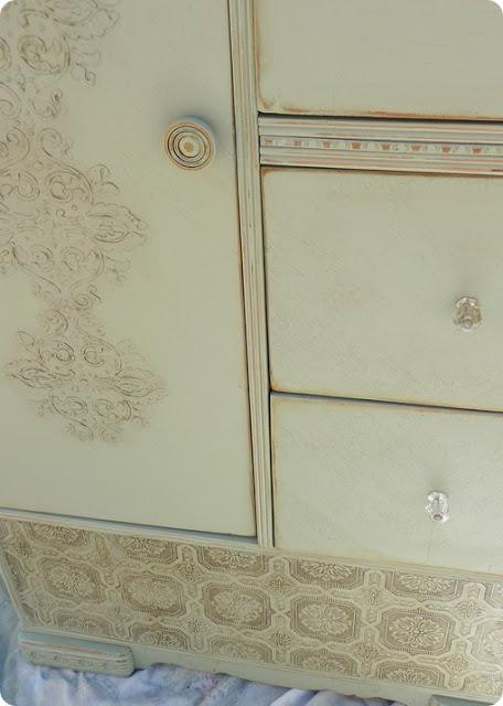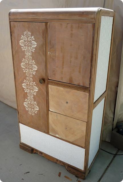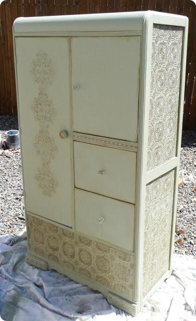 Μπορείτε στα πλαϊνά και στο κάτω μέρος της ντουλάπας να κολλήσετε βαφόμενη αυτοκόλλητη ταπετσαρία. Για να διακοσμήσετε τις πόρτες χρησιμοποιήστε πάστα διαμόρφωσης (κρεμώδης πάστα μοντελοποίησης) και στένσιλς.