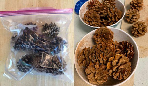 - Στη συνέχεια όταν θα έχουν κρυώσει ,βάλτε τα κουκουνάρια μέσα σε μεγάλα αεροστεγή σακουλάκια.Βεβαιωθείτε οτι δεν θα έχετε παραγεμίσει την σακούλα ώστε να μπορεί να κλείσει με ασφάλεια το σακουλάκι.