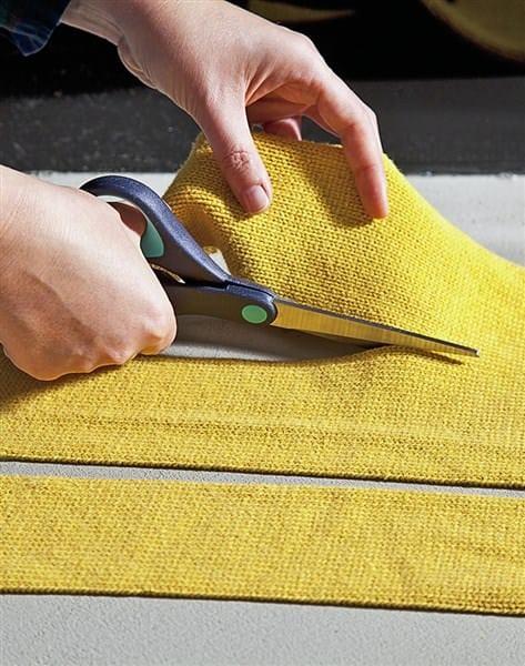 Το ρούχο πρέπει να είναι σχετικά μεγάλο γιατί χρειαζόμαστε 8-10 λωρίδες μήκους περίπου 40 εκ. Βέβαια οι διαστάσεις εξαρτώνται πάντα από το μέγεθος του σκαμπό. Εδώ η περίμετρος είναι 34 εκ.