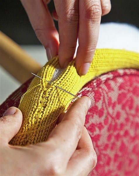 Στη συνέχεια γυρνάμε πάλι το σκαμπο κανονικά, πλέκουμε τις λωρίδες και καρφώνουμε πάλι τις άκρες τους από κάτω με το καρφωτικό.