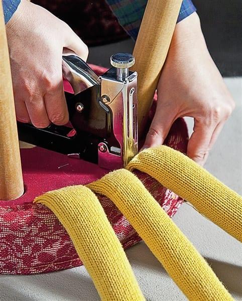 Αφού φτιάξετε όλες τις λωρίδες σας, γυρίστε το σκαμπό ανάποδα και καρφώστε τις.