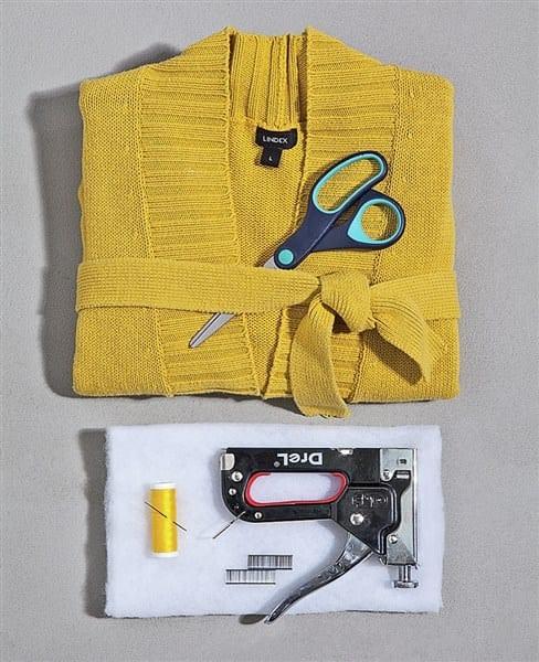 Θα χρειαστείτε: ένα σκαμπό ένα πουλόβερ. (Μπορείτε εξίσου να χρησιμοποιήσετε και άλλα υφάσματα αλλά προσοχή θέλουμε να είναι χοντρά για να αποδώσουμε την αφράτη υφή) ψαλίδι βάτα βελόνι και κλωστή καρφωτικό
