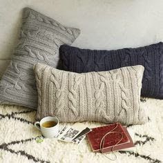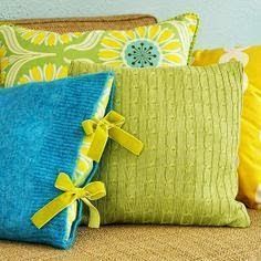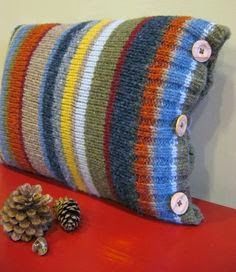 Κάθε είδους πλεχτό, από παλιά πουλόβερ, ζακέτες κλπ. ή και παλιές πλεχτές κουβέρτες ή ριχτάρια μπορείτε εύκολα να τα μετατρέψετε σε καλύμματα μαξιλαριών. Όταν πρόκειται για ρούχο, θα χρειαστεί μόνο να “μελετήσετε” το σχήμα του μαξιλαριού που περισσότερο σας εξυπηρετεί να φτιάξετε, ώστε να εκμεταλλευτείτε όσο γίνεται την ήδη υπάρχουσα μορφή του υφάσματος με όσο το δυνατόν λιγότερο επιπλέον κόπο.