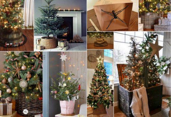 Είτε πρόκειται για φυσικό έλατο είτε για τεχνητό δέντρο, τα ξύλινα ή μεταλλικά πόδια αντίστοιχα, μπορούν να τοποθετηθούν μέσα σε ένα χάρτινο ή ξύλινο κουτί, καλάθι,γλάστρα και κάθε τύπου παρόμοιο «δοχείο», σε μέγεθος τέτοιο ώστε να είναι στερεωμένα σταθερά, μια επιλογή πιο καλαίσθητη και «φυσική» από το να προσπαθήσετε να …κρύψετε την βάση με κάποια φάτνη ή τις ειδικές υφασμάτινες «ποδιές» που θα βρείτε στα καταστήματα με χριστουγεννιάτικα.