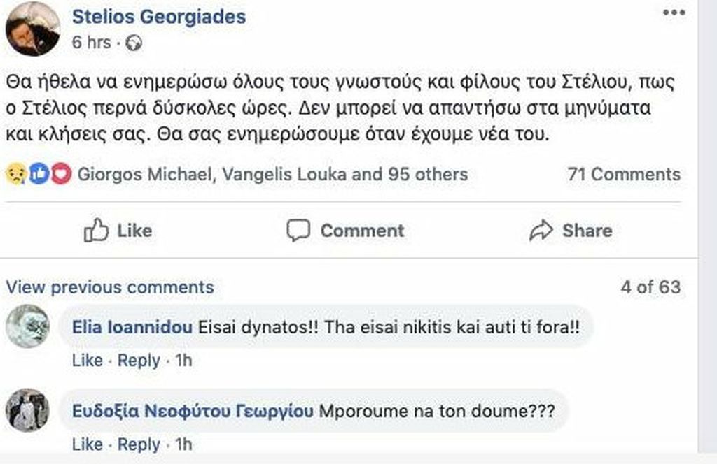 Άνθρωπος που χειρίζεται τη σελίδα του στα social media έγραψε: «Θα ήθελα να ενημερώσω όλους τους γνωστούς και φίλους του Στέλιου, πως ο Στέλιος περνά δύσκολες ώρες. Δεν μπορεί να απαντήσει στα μηνύματα και κλήσεις σας. Θα σας ενημερώσουμε όταν έχουμε νέα του», έγραψε άνθρωπος από τον στενό κύκλο του ηθοποιού, Στέλιου Γεωργιάδη.